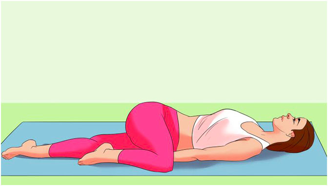 2. Lege dein linkes Knie auf die linke Seite deines Körpers und beuge das Knie, wobei dein Fuß zur Wand hinter dir zeigt. Dein linker Fuß sollte gebeugt sein.