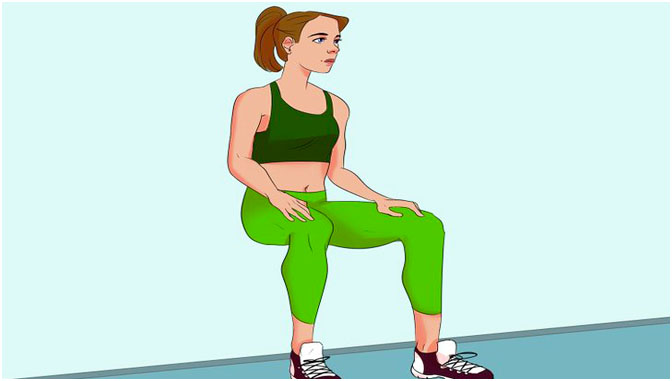 1. Lehne dich mit dem Rücken gegen die Wand und gehe dann in die Stuhlposition, indem du dich nach unten bewegst, bis deine Oberschenkel parallel zum Boden sind.