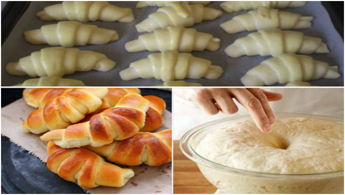 5. Um die Hörnchen zu formen, die einzelnen Stücke vom breiten Teil aus zur Spitze hin rollen. Dabei nicht zu fest drücken, sondern einfach locker rollen und danach gleichmäßig auf einem mit Backpapier ausgelegten Backblech verteilen.