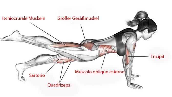 Diese Bewegung strafft nicht nur die Arm- und Bauchmuskulatur, sondern trägt auch zur Stärkung der Rücken- und Schultermuskulatur bei. Machen Sie 4 Sätze zu je 10 Wiederholungen.