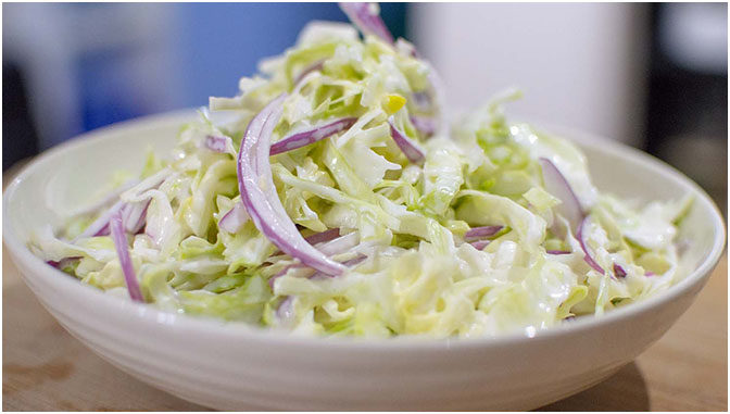 Anmerkung: Die Menge des Wassers und Essigs der Größe des Weißkohls anpassen. Der Sud wird vor dem Servieren abgegossen.Den Strunk vom Kohl entfernen. Den Kohl fein raspeln und in eine Schüssel geben. Die Zwiebeln in kleine Würfel schneiden und zum geraspelten Kraut geben.