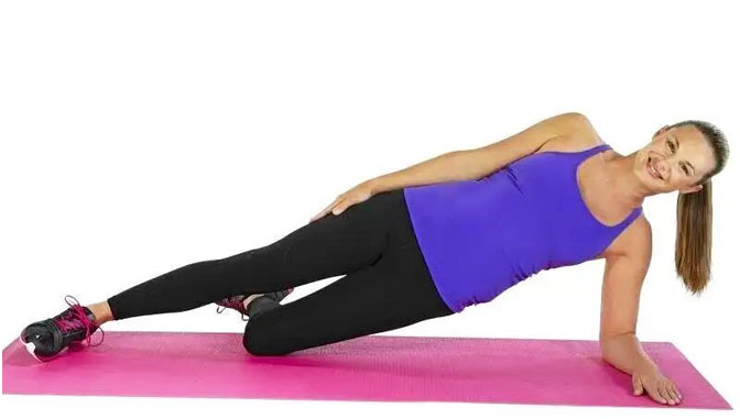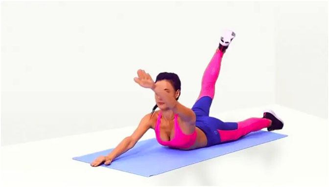 Diese Bewegung wird empfohlen, um eine Wespentaille zu bekommen. Außerdem wird der Rücken gestrafft. Legen Sie sich für diese Übung auf die Seite und stützen Sie sich mit dem Arm ab. Die Haltung sollte gerade und angespannt sein.