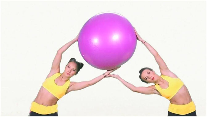 Für diese Übung benötigen Sie einen Fitnessball. Dehnen Sie sich seitlich, während Sie das Accessoire tragen. Führen Sie die gleiche Bewegung etwa 15 Sekunden lang auf der anderen Seite durch.