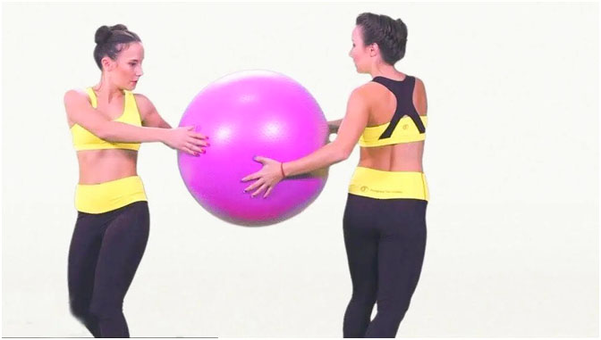 Diese Bewegung ist ideal, um die schrägen Bauchmuskeln und Ihre Bauchmuskeln zu straffen, und beansprucht Ihren Rücken. Während Sie den Ball gerade vor sich halten, machen Sie seitliche Bewegungen von links nach rechts. Wiederholen Sie die Übung 15 Mal.