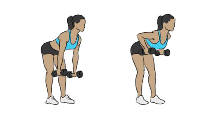 Mit dieser Bewegung beanspruchen Sie den Rücken und den Bauchgürtel. Es ist ganz einfach: Halten Sie die Hanteln mit ausgestreckten Armen und einem geraden Rücken fest und führen Sie die Hanteln dann zur Brust. Machen Sie 15 Wiederholungen dieser Übung.