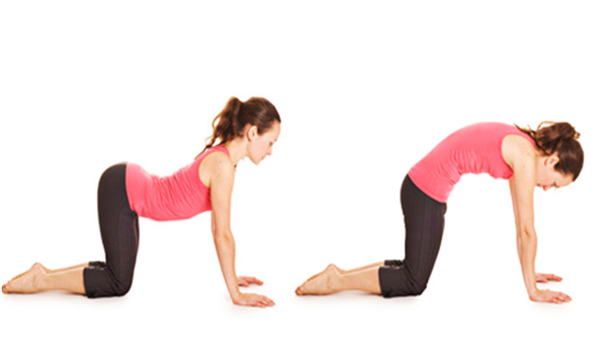 Gehen Sie auf alle Viere, beugen Sie den Rücken so weit wie möglich und heben Sie die Brust, indem Sie die Schultern nach hinten ziehen. Halten Sie die Stellung 10 Sekunden lang und atmen Sie dabei langsam und tief. Kehren Sie in die flache Rückenlage zurück und führen Sie dann eine umgekehrte Bewegung durch, indem Sie den Rücken so weit wie möglich anheben und das Kinn in die Brust ziehen. Halten Sie die Bewegung 10 Sekunden lang, lassen Sie dann los und wiederholen Sie sie.