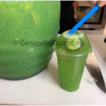 - Die reife Melone halbieren und die Kerne entfernen – so gut es eben geht. Danach die beiden Hälften in Spalten schneiden, das Fruchtfleisch herausschneiden und würfeln und so gut wie möglich mit einem Stabmixer pürieren.