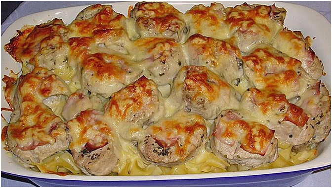 Nudeln kochen, abschrecken und mit 50 g Käse mischen. In eine Auflaufform geben. Schweinefilet in ca. 2 cm dicke Scheiben schneiden und mit Salz, Pfeffer und Majoran würzen. Butter erhitzen, Fleisch darin von beiden Seiten anbraten, aus der Pfanne nehmen und auf die Nudeln legen. Bratensatz mit der Brühe und Sahne aufgießen. Die Soße etwas einkochen lassen und mit Salz, Pfeffer, Majoran und einem Schuss Weißwein kräftig abschmecken und über das Fleisch geben. Schinken in Streifen schneiden und darauf legen. Geriebenen Käse darüber streuen. Im Backofen bei 200 °C ca. 20 Minuten überbacken