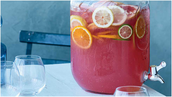 Orangen und Limetten heiß waschen, trockenreiben und in Scheiben schneiden.