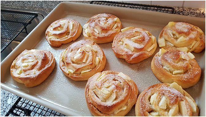 Jetzt die Scheiben mit etwas Abstand, auf ein mit Backpapier ausgelegtes Backblech legen und ca. 20 Minuten backen. Die Apfelschnecken sollten hinterher ganz auskühlen.
