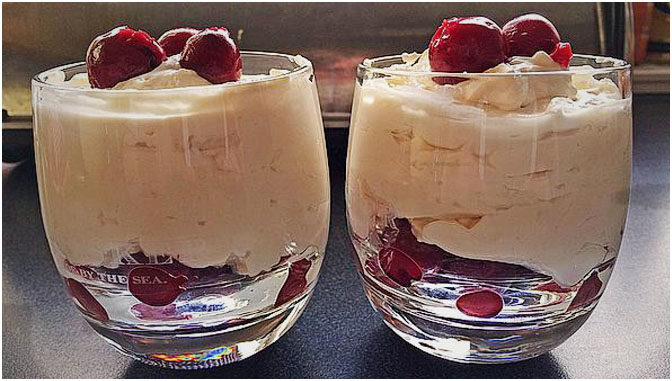 Bis auf die Sauerkirschen alle Zutaten mit einem Handrührgerät gut vermengen. Zum Schluss die abgetropften Sauerkirchen unterheben. Bis zum Verzehr im Kühlschrank ca. 3 – 4 Stunden gut durchziehen lassen.