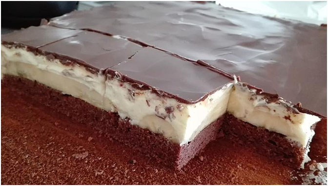 Die Creme: Den Pudding wie gewohnt zubereiten und ganz kalt werden lassen. Butter und Zucker schaumig rühren, den Topfen dazu rühren. Nach und nach den kalten Pudding beifügen. Die Sahne steif schlagen und unterheben. Die Bananen in nicht zu dünne Scheiben schneiden und den kalten Kuchen damit belegen, darüber die Creme verteilen und mit Schokoglasur überziehen – Kalt stellen!