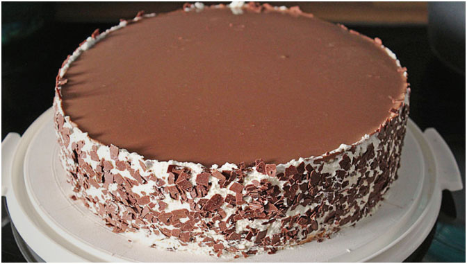 Einen Becher Sahne und die Schokolade im Topf erhitzen, nebenbei die Gelatine quellen lassen und zu der Sahne und der Schokolade zugeben und unterrühren. Wenn die Schokolade geschmolzen ist, vom Herd nehmen. Lange abkühlen lassen (es gibt sonst Klümpchen). Erst wenn der Guss schon wieder fest wird auf die gekühlte Torte gießen. Im Kühlschrank noch mal kühlen lassen.