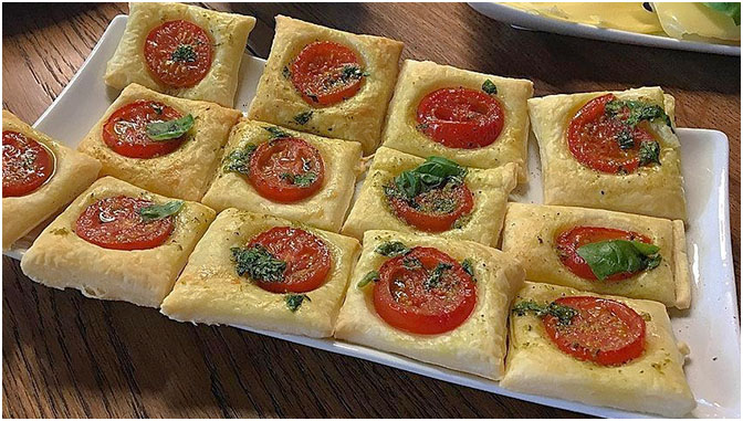 Den Blätterteig aus der Packung nehmen, in ca. 4 cm x 4 cm große Quadrate schneiden und auf ein mit Backpapier belegtes Blech legen. Mit etwas Milch bestreichen. Tomatenscheiben auflegen, dabei einen kleinen Rand freilassen und pfeffern.