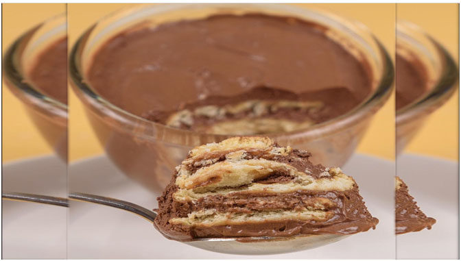 Bedecken Sie nun die Keksschicht mit dem Schokoladenpudding und wiederholen Sie das mit insgesamt 3 Schichten. Schließen Sie mit Schokopudding ab.