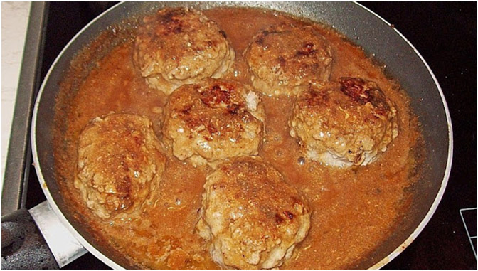 In der beschichteten Pfanne mit etwas Öl 4-5 Frikadellen braten. Man kann aus dem Teig auch einen leckeren Hackbraten (im Ofen bei 180° ca. 30 Minuten) machen oder Paprikaschoten damit füllen. In der Pfanne bildet sich durch den Hüttenkäse eine leckere Sauce. Diese mit etwas saurer Sahne abbinden.