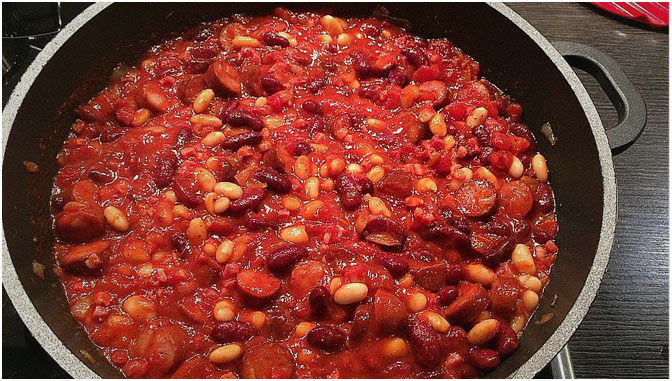 Dann zerquetsche ich die Tomaten aus der Dose und gebe sie samt dem Saft aus der Dose hinzu. Jetzt kommen die, vorher in einem Sieb abgetropften, Bohnen hinzu und das Ganze bleibt auf der Platte, bis alles schön heiß ist.