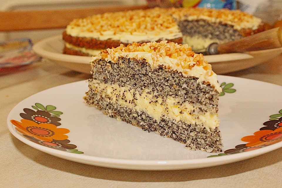Illes super schneller Mohnkuchen ohne Boden mit Paradiescreme und Haselnusskrokant