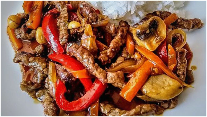 Das Fleisch aus der Marinade nehmen, leicht abtupfen und in heißem Öl unter dauerndem Rühren kurz braten. Herausnehmen und die Zwiebeln im verbliebenen Bratfett ebenfalls unter Rühren braun braten. Das restliche Gemüse zugeben und 2 – 3 Min. mitbraten, dann das Fleisch wieder hinzugeben.
