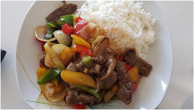 Das Fleisch aus der Marinade nehmen, leicht abtupfen und in heißem Öl unter dauerndem Rühren kurz braten. Herausnehmen und die Zwiebeln im verbliebenen Bratfett ebenfalls unter Rühren braun braten. Das restliche Gemüse zugeben und 2 – 3 Min. mitbraten, dann das Fleisch wieder hinzugeben.