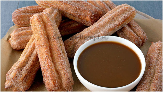 - Die Churros mit geschmolzener Butter bepinseln. Ein oder zwei Churros auf einmal in die Tüte mit dem Zimtzucker legen. Schütteln, um sie mit der Mischung zu bedecken. Schmeckt übrigens auch toll mit Schokosoße!