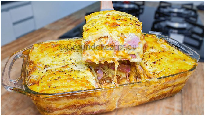 Mit dem geriebenen Käse bestreuen und Butterflöckchen draufsetzen. Im auf 220° vorgeheizten Backofen 15 Minuten garen, bis der Käse zerläuft. Evtl. am Ende mit dem Grill kurz übergratinieren