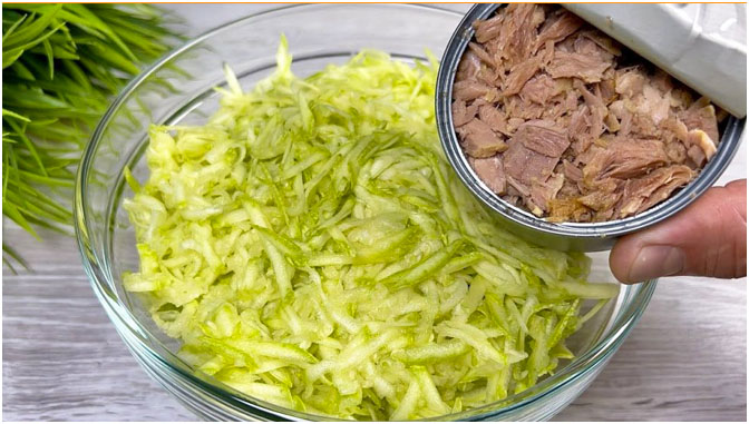 Nun die geriebene Zucchini in eine Schüssel geben, den geriebenen Käse, die Petersilie, die Oliven, die Frühlingskräuter, den Thunfisch, die Eier, Salz, Pfeffer, Mehl, Backpulver und Öl hinzufügen.