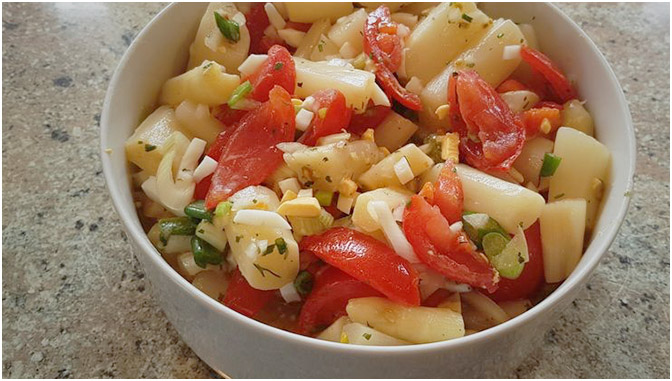 3 Für das Dressing Essig, Öle, Zitronensaft, Senf, Zucker, Salz, Basilikum und Pfeffer pürieren. Alles vermischen und 30 Minuten ziehen lassen. Mit Basilikum garniert servieren.