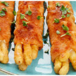 - 2. Spargel schälen, holzige Enden abschneiden. Spargel in ca. 5 cm große Stücke schneiden. Wasser aufkochen, mit Salz und etwas Zucker abschmecken und den Spargel darin ca. 5 Minuten garen. Zum Abtropfen auf Küchenpapier geben.