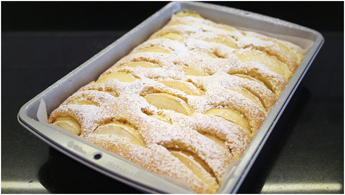 - 3. Puddingpulver, Mehl und Backpulver mischen. Mehl-Mischung und Milch abwechselnd unter den Teig heben. Äpfel unter den Teig heben. Teig in eine gefettete, mit Mehl ausgestäubte Springform (26 cm Ø) geben und glatt streichen. Kuchen im vorgeheizten Backofen (E-Herd: 175 °C/ Umluft: 150 °C/ Gas: s. Hersteller) ca. 45 Minuten backen.