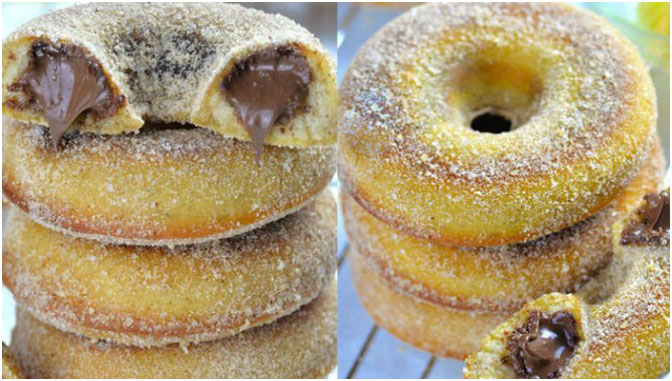 6 Mit einem Holzstäbchen jeweils ein Löchlein in die Teig-Ringe stechen. Mithilfe des Spritzbeutels die Nutella-Creme ins Innere der Teig-Ringe spritzen.