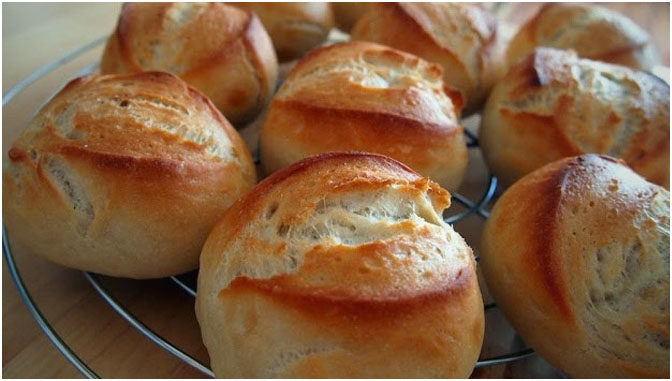 Die Brötchen raus holen, prüfen ob sie gar sind (auf den Boden klopfen, wenn es hohl klingt, sind sie gut) und auf einem Gitter abkühlen lassen.