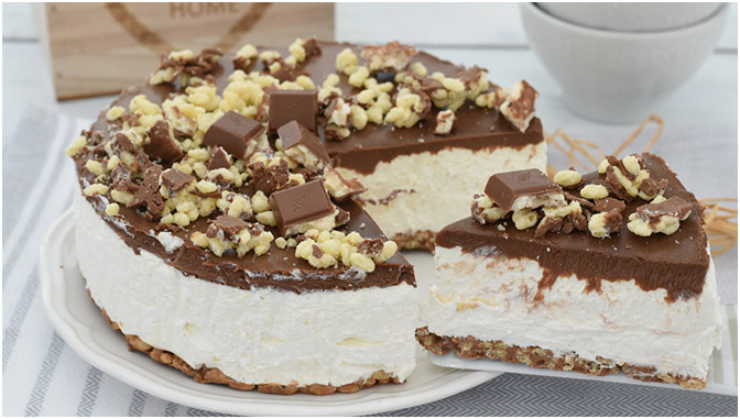 Die Schokolade im Wasserbad schmelzen und den gepufften Reis unterrühren.Anschließend in eine mit Backpapier ausgelegte Tortenform mit 22 cm Durchmesser hineindrücken. In den Kühlschrank stellen und inzwischen die Füllung zubereiten.