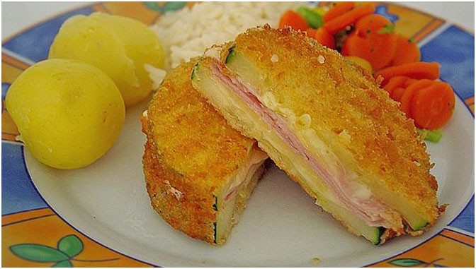 Dieses Rezept ist so simpel und dabei so lecker: Zucchini (idealerweise hat er einen Durchmesser von mindestens 10 cm) in ca. 5 mm dicke Scheiben schneiden. Zwischen jeweils 2 Scheiben Zucchini je eine Scheibe Schinken und eine Scheibe Käse legen. Ich steche Schinken und Käse immer mit einem großen runden Ausstecher aus, aber das muss nicht sein. Hauptsache, es steht nicht allzu viel über. Man muss nicht mit einem Zahnstocher o.Ä. fixieren, die Scheiben halten auch so gut zusammen. Dann die fertig gestellten Cordon bleus mit wenig Salz und Pfeffer würzen und panieren. Erst in Mehl, dann in verquirltem Ei und zuletzt in Semmelbröseln wenden. Das Butterschmalz in einer Pfanne erhitzen und die Zucchini-Cordon bleus von beiden Seiten knusprig goldbraun ausbacken.