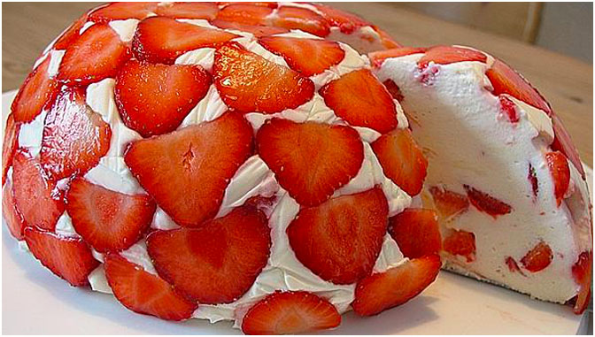 Bombe auf einen Teller stürzen und Frischhaltefolie vorsichtig abziehen. Servieren und genießen.