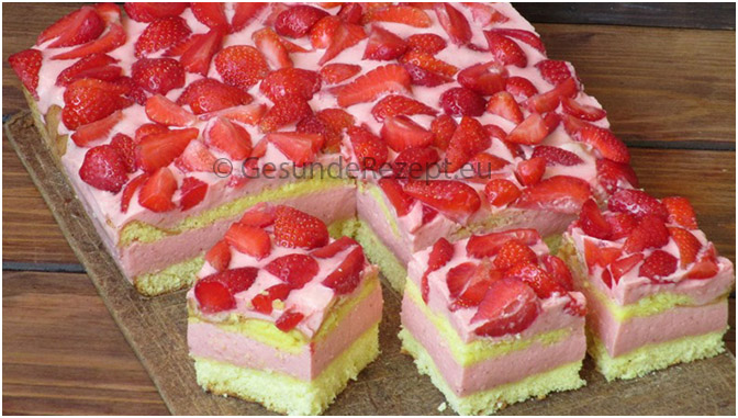 Für die Füllung den Frischkäse, das Joghurt, den Zucker, Vanillezucker und die Erdbeeren verrühren. Die Gelantine einweichen, ausdrucken und erwärmen bis sie flüssig ist. Mit etwas von der Creme verrühren und dann mit den klein geschnittenen Erdbeeren unter den Rest der Creme heben. Im Kühlschrank leicht gelieren lassen und dann die geschlagene Sahne unterheben.
