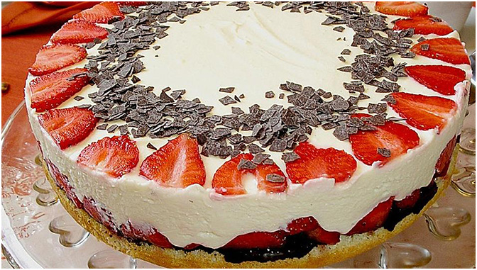 Inzwischen die Erdbeeren waschen und abtropfen lassen. Den Schokoguss im heißen Wasserbad schmelzen. Den Formrand um den Boden setzen. Den Boden mit 2/3 des Schokogusses bestreichen und noch auf den flüssigen Guss die Erdbeeren setzen. 12 der Erdbeeren zur Seite stellen.