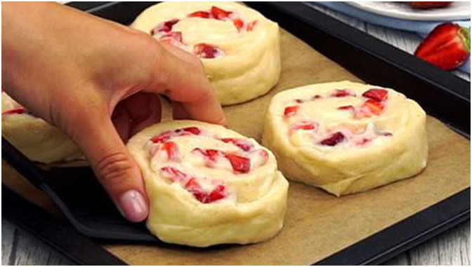 5.Pudding gleichmäßig auf dem Hefeteig verstreichen, dabei einen etwa 2 cm breiten Rand lassen. Erdbeeren darauf verteilen. Teig von der langen Seite her eng aufrollen, das Ende etwas zusammendrücken.