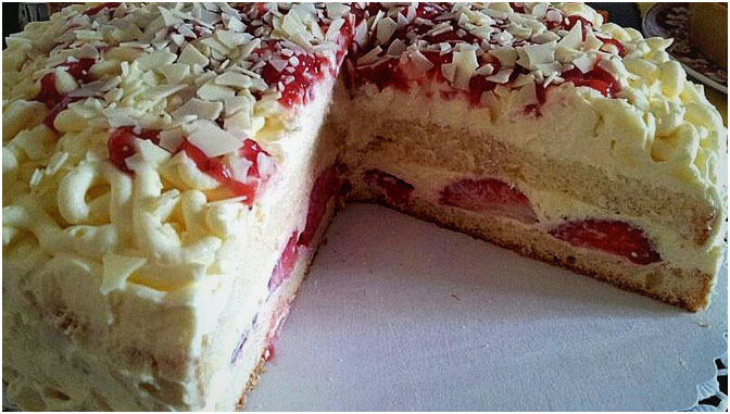 Den ausgekühlten Biskuit einmal durchschneiden. Den ersten Boden dünn mit der Creme bestreichen, mit den leicht gezuckerten Erdbeeren belegen und mit ca. einem Drittel der Creme bestreichen. Den zweiten Boden darauf legen und die Torte rundum bestreichen. Den Rest der Creme in einen Spritzbeutel mit kleinem Lochaufsatz füllen und als Spaghetti auf die Torte spritzen.