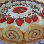 Den ausgekühlten Biskuit einmal durchschneiden. Den ersten Boden dünn mit der Creme bestreichen, mit den leicht gezuckerten Erdbeeren belegen und mit ca. einem Drittel der Creme bestreichen. Den zweiten Boden darauf legen und die Torte rundum bestreichen. Den Rest der Creme in einen Spritzbeutel mit kleinem Lochaufsatz füllen und als Spaghetti auf die Torte spritzen.