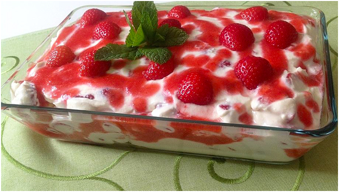 Eine Form mit Löffelbiskuits auslegen und diese mit Orangensaft beträufeln. Erdbeermark und Mascarponecreme abwechselnd auf die Löffelbiskuits schichten, anschließend kalt stellen.