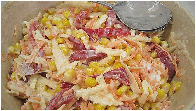 Die Maiskörner und die Paprikastreifen abtropfen lassen un d in eine Schüssel geben. Die Möhren schälen, grob raspeln und dazugeben. Die Äpfel schälen, entkernen, ebenfalls grob raspeln, dazugeben und sofort mit dem Limettensaft beträufeln, damit sie nicht braun werden.