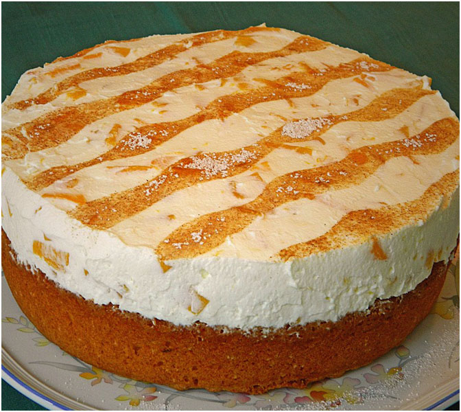 Schmand und 2 Päckchen Vanillezucker verrühren. Sahne unter den Schmand ziehen und die Pfirsichstücke unterheben. Pfirsich-Schmand gleichmäßig auf dem Kuchen verstreichen.