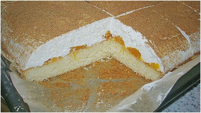 Ein Backblech einfetten und den Teig darauf glatt verstreichen. 25 Minuten bei 150° backen.