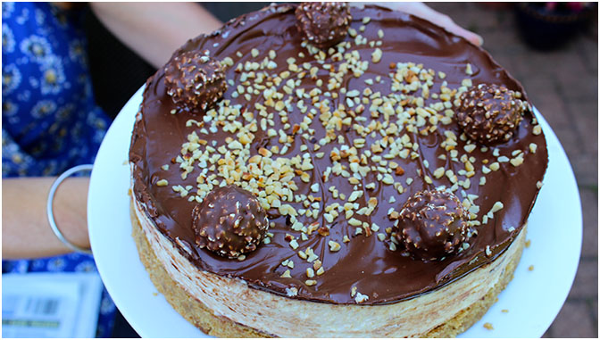 Den letzten Becher Sahne steif schlagen und damit den Rand bestreichen sowie etwas für die Dekoration übrig lassen. Die 6 beiseite gelegten Rocher nun halbieren und oben auf dem Tortenrand verteilen (das ergibt dann 12 Tortenstücke). Mit der restlichen Sahne nach Bedarf verzieren. Bis zum Verzehr kalt stellen.