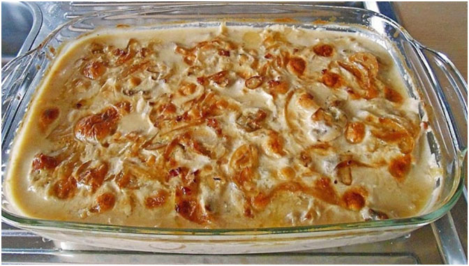 Filet in Scheiben schneiden, mit Salz und Pfeffer würzen, kurz anbraten. Zwiebeln, Speck und Pilze zerkleinern und anbraten bzw. dünsten. Alle Zutaten in eine feuerfeste Form schichten. Die Sahne aufkochen, mit etwas Speisestärke binden, kräftig würzen und über die Zutaten gießen. Im Backofen bei 200 bis 220 Grad ca. 30 Minuten garen.