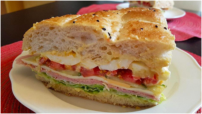 Mittig aufschneiden und sowohl die obere als auch die untere Hälfte mit Remoulade bestreichen. Mit Eisbergsalatblättern oder Krautsalat den unteren Deckel belegen. Darauf folgend den Kochschinken und Käse in Scheiben, sowie die in Scheiben geschnittenen Tomaten und Gurken. Den oberen Deckel darauf legen.