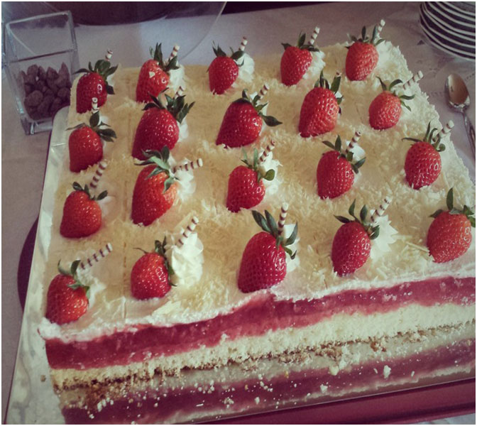 Das Mehl mit dem Backpulver mischen und sieben. Durch das Sieben wird der Teig besonders luftig. Die Masse auf einem tiefen, mit Backpapier ausgelegten Blech verteilen und bei 175° C ca. 20 Min. backen.