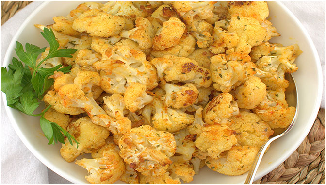 Backofen auf 230° C vorheizen. Blumenkohlrößchen mit Öl auf ein Backblech legen und mit Salz und Pfeffer würzen. Etwa 20 Minuten garen lassen, bis sie weich sind. Danach das Backblech heraus nehmen und den Blumenkohl mit geriebenem Cheddar belegen. In den Ofen zurück und ca. 2 Minuten weiter garen, bis der Käse geschmolzen ist.