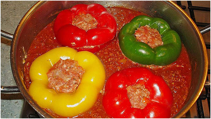Die 4 gefüllten Paprikaschoten in den Topf setzen und ca. 1 Stunde bei milder Hitze schmoren.